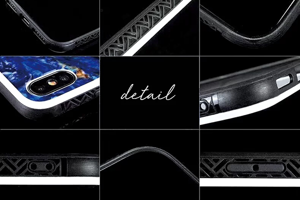 スマホケースの背面(プリント面)はガラスでカバー。その艶やかさはデザインをより魅力的に彩ります。そして、スマホカバーは手に馴染むTPUを使用。さりげない側面ディテールは強化ガラスによる高級感を引き立てるプロダクトとしても最上級のスマホケースです。また便利なカメラホール付きで機能的です。
