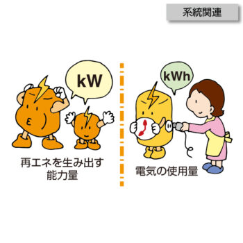 キロワット(kW)とキロワットアワー(kWh)の違いを説明する際に使用するイメージイラスト。