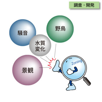 再生可能エネルギー導入の際、その地域の特性や長所を損なうことの無いようゾーニングを行い、トラブル防止を回避するイメージイラスト。