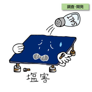 海風や波しぶきなどで含まれる塩分によって再生可能エネルギーの設備が腐食して錆びたりビスが外れたりしている塩害のイメージイラスト。