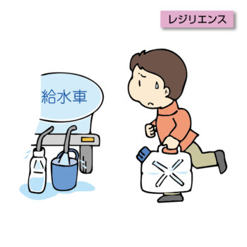 災害が起き被災した地域にきた給水車にポリタンクで水を汲みに行く住民のイメージイラスト。