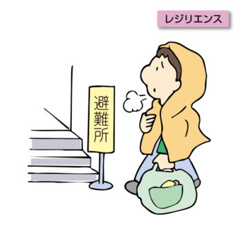 災害に見舞われた地域の住民が家に留まるのに危険を感じ、取るものも取りあえずやっとの思いで避難所に到着した様子のイメージイラスト。