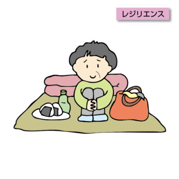 豪雨や地震など、さまざまな災害が起きたとき、避難所に身を寄せる地域住民のイメージイラスト。