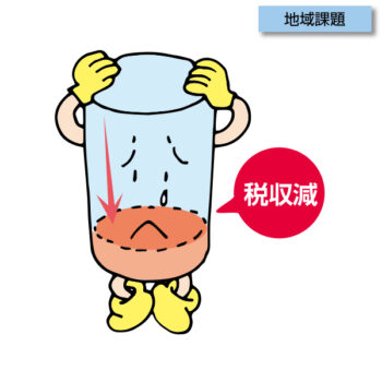 地域の過疎化や高齢化によって税収が年々減っていき、自治体の財政が極めて厳しいという現状のイメージイラスト。