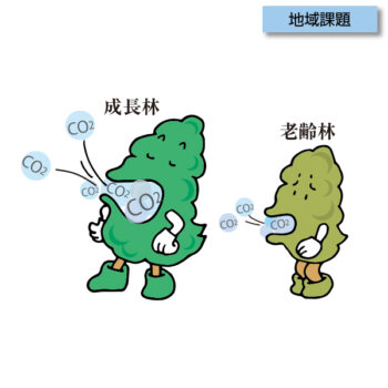 成長林は多くの二酸化炭素を取り組み、地球環境に貢献、また老齢林は吸収量が少なくなってくるという比較イメージイラスト。