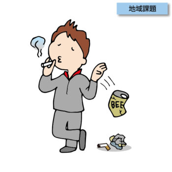 ゴミ問題が深刻な中、ゴミを減らす、ゴミの分別、ゴミの持ち帰りが必要であることを示唆するために、やってはいけないシーンのイメージイラスト。