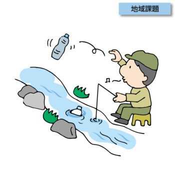 河川などを通じて海へ流出する海洋プラスチックごみの元になるポイ捨てのイメージイラスト。