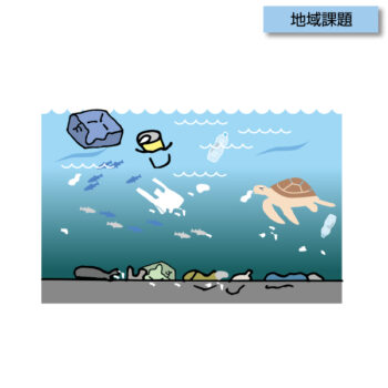 ポイ捨てや放置されたプラスチックごみが、河川などを通じて海へ流出し、海洋プラスチックごみとして、海岸や海底にたまったり、水中を浮遊したりしているイメージイラスト。