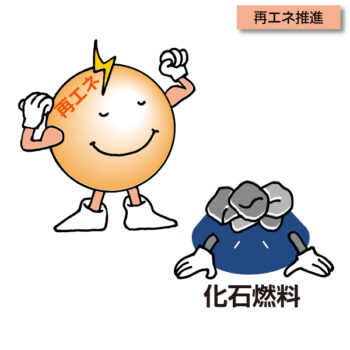 今まで依存していた化石燃料、これからは再エネを推進していくために化石燃料を使わなくしていくイメージイラスト。