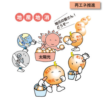 地域の太陽光利用で発電したエネルギーをその地域で使う、地産地消のイメージイラスト。