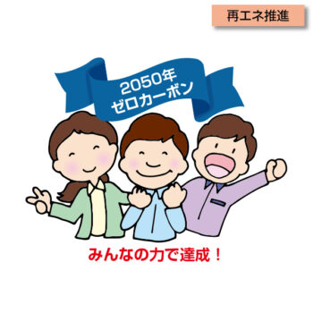地域自治体がみんなの協力で2050年にゼロカーボンシティーを達成しようとスローガンを掲げているイメージイラスト。