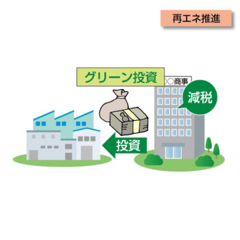 省エネルギーを促進する技術や施設を作り、環境に配慮した経済活動への投資をした企業は減税の対象になる、というイメージイラスト。