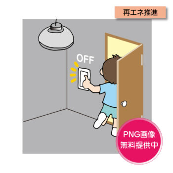 電気の消費を少しでも少なくするため、使わない部屋の電灯は消そう、というイメージイラスト。